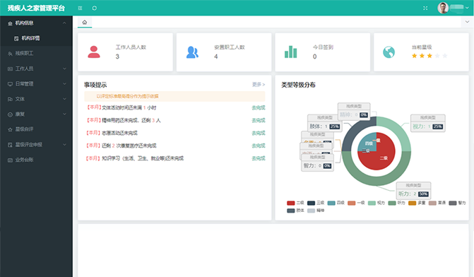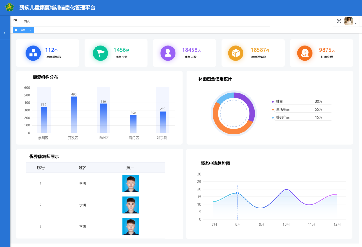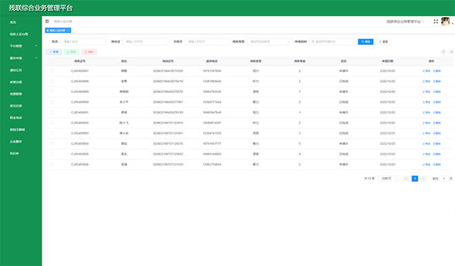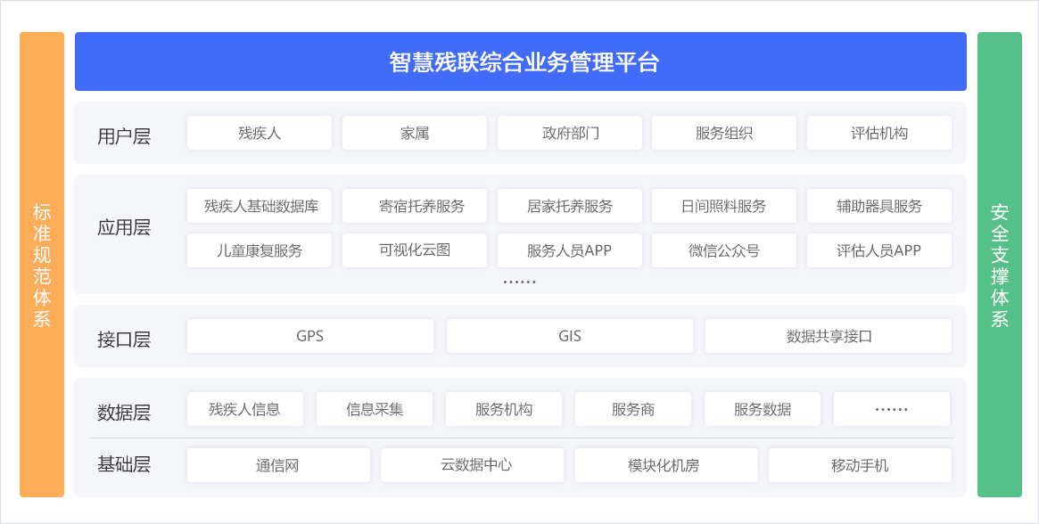 通過搭建“省-市-區(qū)(縣)-街道-社區(qū)”五級管理體系,建設(shè)殘疾人檔案、機(jī)構(gòu)、輔具、康復(fù)、就業(yè)、慈善、無障礙等方面的綜合業(yè)務(wù)管理平臺,滿足主管部門的業(yè)務(wù)協(xié)同、數(shù)據(jù)交換、部門溝通等的扎口管理需求。借助“助殘服務(wù)直通車“,配套5大類助殘智能終端,提供輔具租賃、居家安防、居家探訪、兒童康復(fù)等助殘服務(wù),實(shí)現(xiàn)殘聯(lián)工作統(tǒng)籌整合、有序管理,提高基層人員工作效率,提升殘疾人幸福感。